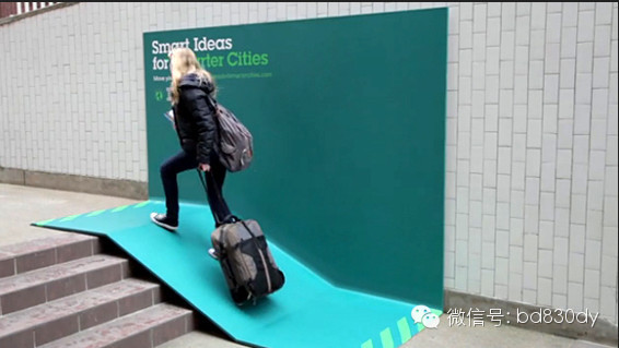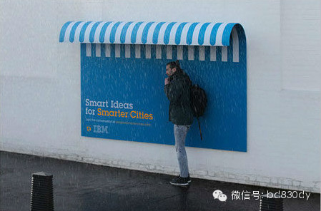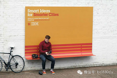 奥美(Ogilvy & Mather)为IBM 设计的户外广告牌,打破传统户外广告的设计思路,加入更多功能性元素,将死板的广告牌打造成了避雨亭、长凳和无障碍坡道,充满了浓浓的人情味。广告主题“Smart Ideas for Smarter Cities.”