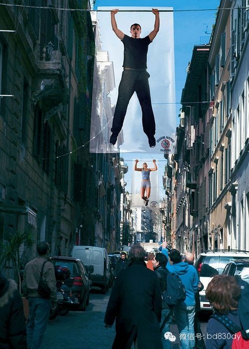 美国广告大师威廉·伯恩巴克曾说:“你没有吸引力使人来看你的广告,那么不管你在广告中说了些什么,你都是在浪费金钱。”只需要一张做引体向上动作的人物画布,街道上方的横杆就能创意成体育器材中的单杠。
