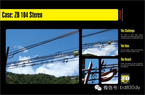 洪都拉斯ZB104.9音乐电台的广告,也有将户外电线顺势变成五线谱的创意。