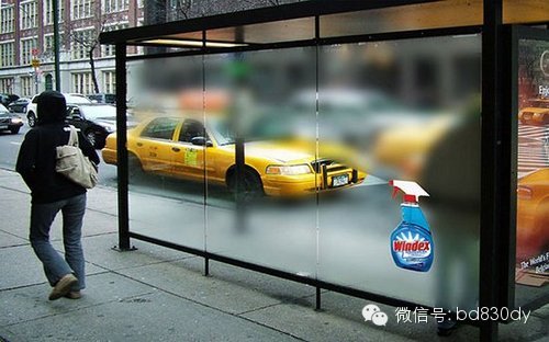 Windex玻璃清洁剂的公交站台广告,仅在玻璃上贴了形成磨砂效果的膜,巧妙运用了周围环境。学生作品,来自Jeseok Yi。