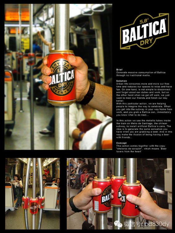 俄罗斯的Baltica啤酒以一种很特别的方式出现在智利的地铁站中,广告巧妙地将啤酒罐做成地铁里的把手,手握栏杆的时候,好似手握啤酒瓶。大家一起握的时候,是不是还有种共同畅饮碰杯的感觉?